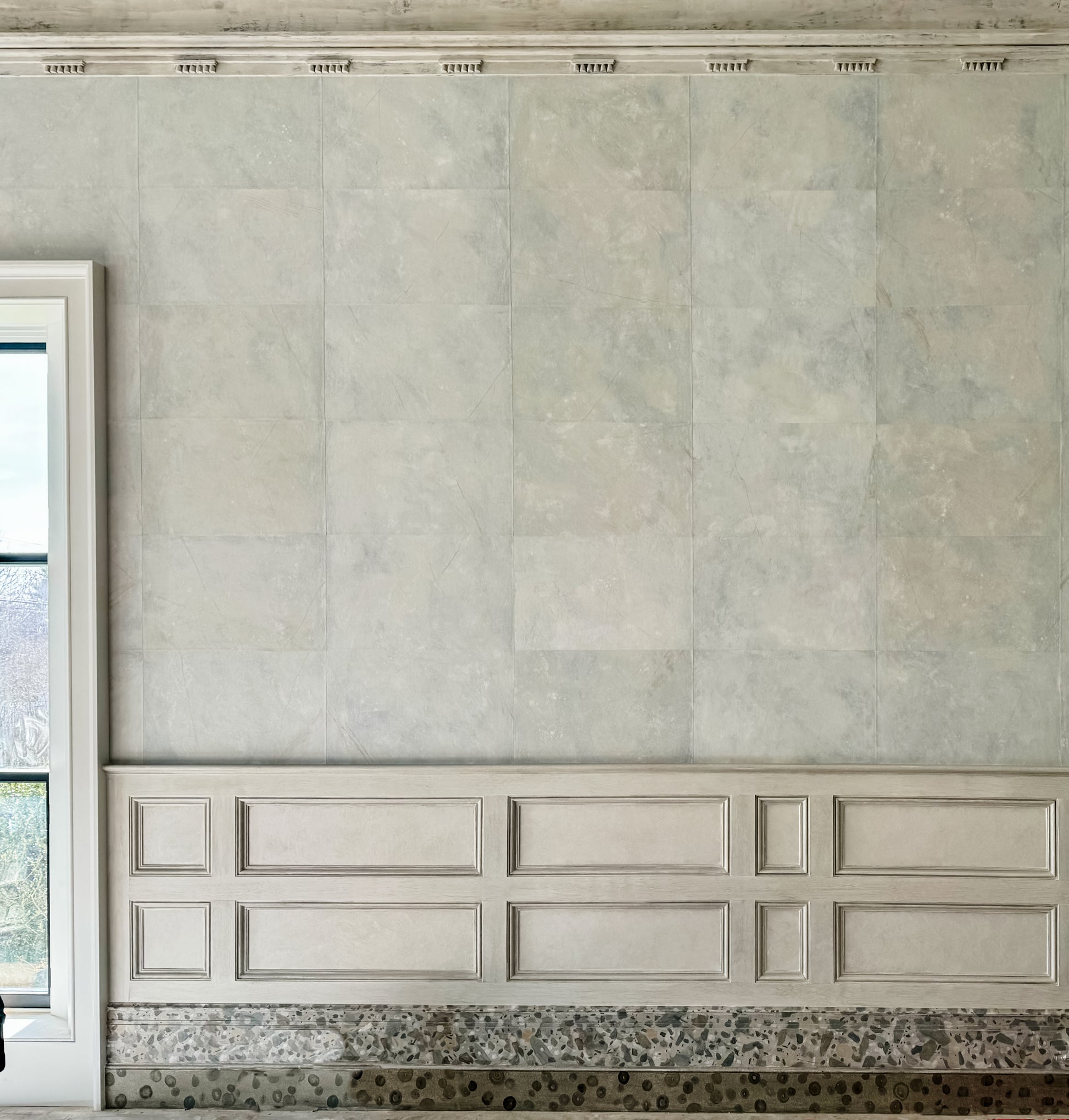 Horizon & Hazy Sky are reminiscent of stacked stone. With layers of Venetian plaster, mottled color washes and naive veining, each paper is finished with a slight burnish, giving a soft twinkling sheen.